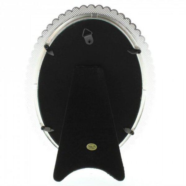 This picture frame is sure to draw some attention! Features a row of sparkling rhinestones around the oval 5x7 frame. Easel stand for tabletop display. 1 pound. 6.25 x 3.75 x 8 inches tall. Zinc alloy and glass.