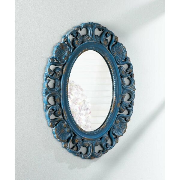 Seashells and ornately carved waves surround this vintage-style oval wall mirror. The wooden frame features a weathered blue finish.The color of this item may vary due to the distressed finish. 3.2 pounds. 17.2 x 19.8 x 21.2 inches tall. Mirror: 8.6 x 12.5 inches tall. MDF wood frame.