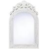 Vintage style mirror with white distressed finished wood frame. Fleur de lis and scrollwork on the arch. 12.5 x 0.5 x 20 inches tall. Weight 3 pounds. Pine wood and MDF wood.
