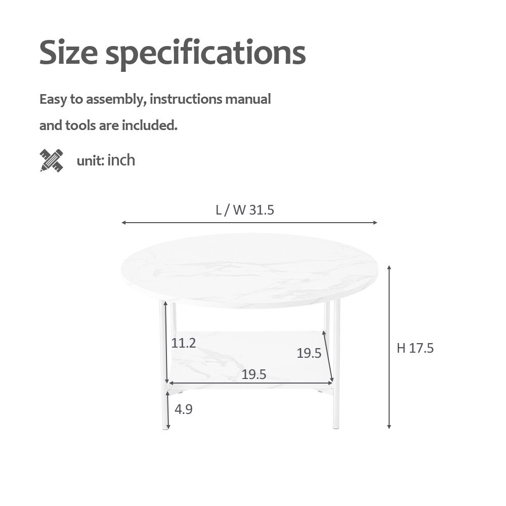 Elegant appearance but lightweight:The 2-tier coffee table is made from mdf with faux marble color design is super easy to move as its structure is simple and lightweight. So you can easily configure it in any spaces such as living room; office; etc.