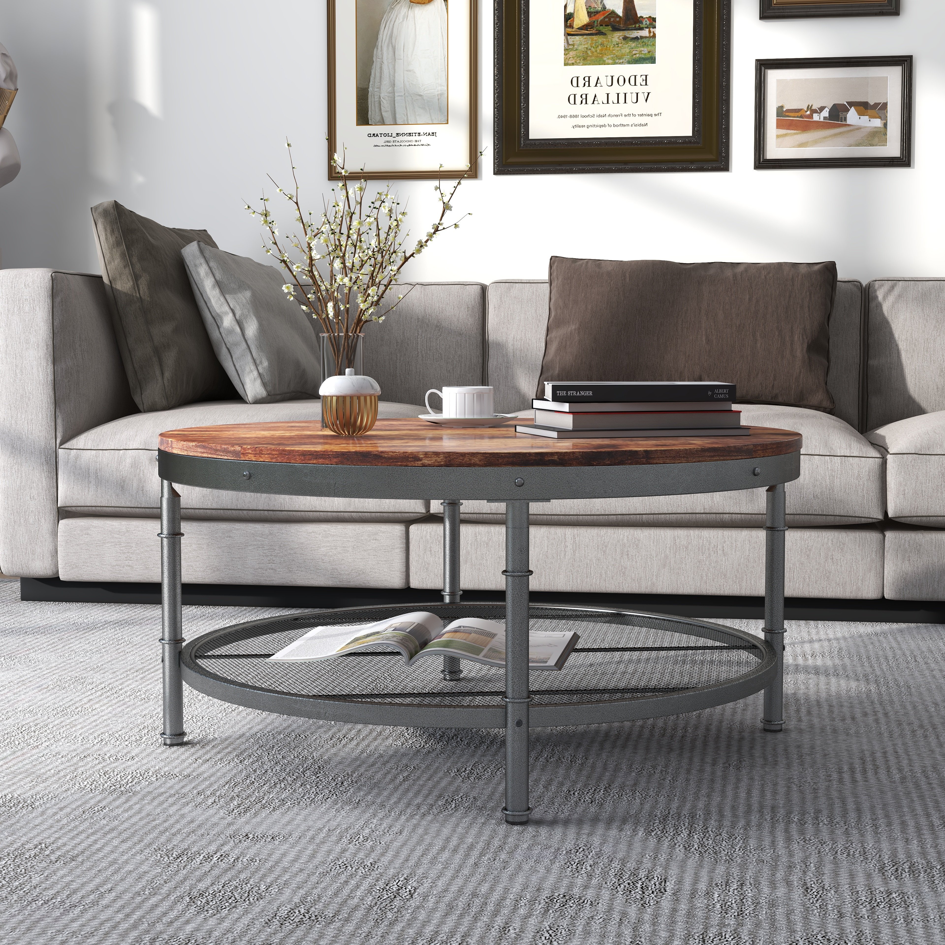 2-Tier Single Panel Round Coffee Table for Living Room and Bedroom; with 3D Texture Metal Frame and Mesh