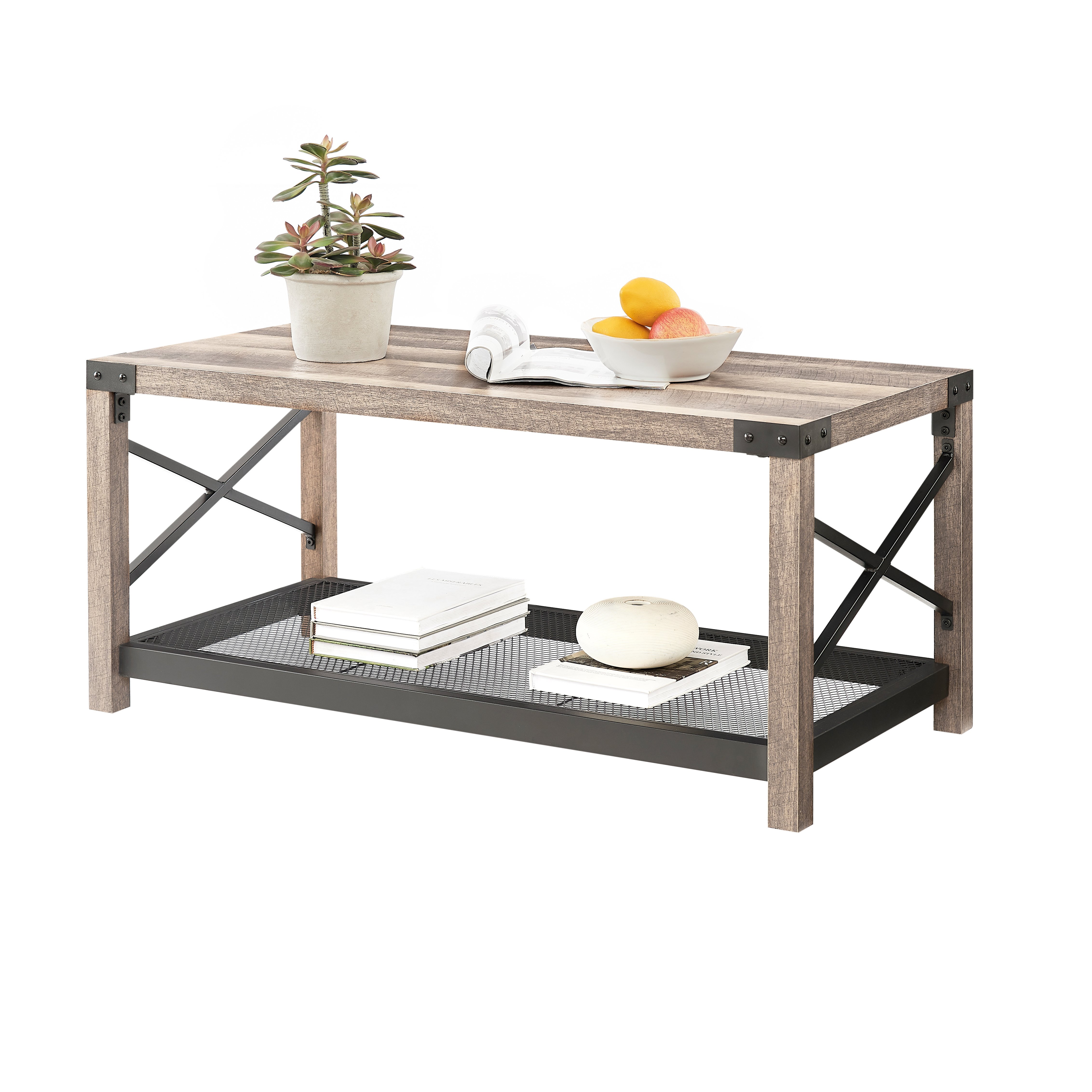 1.Rustic Style: This coffee table was designed with farmhouse style, along with the double x-crossed sides, mesh shelf and metal corner protectors. Open shelves are perfect for storage and displaying decoration items.